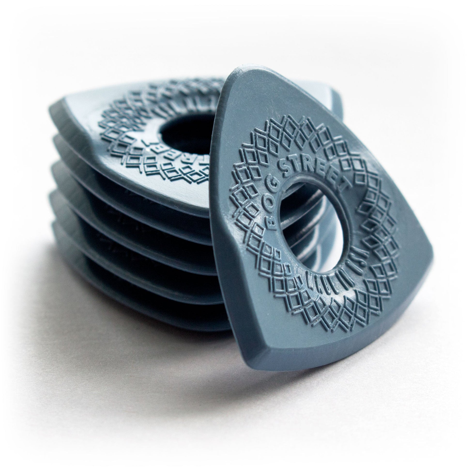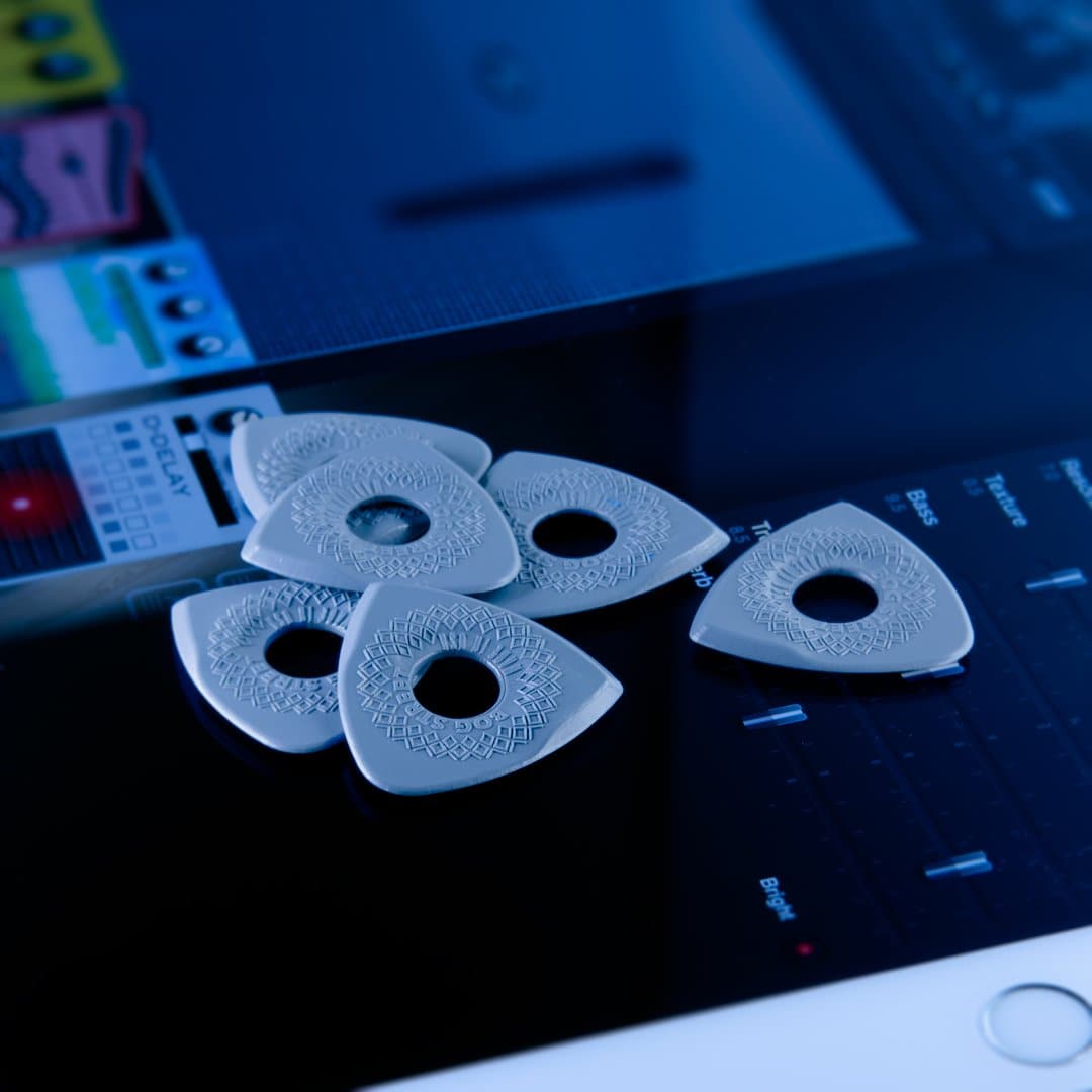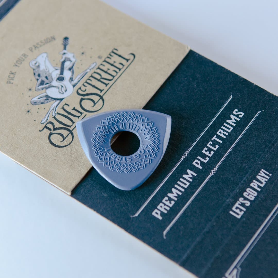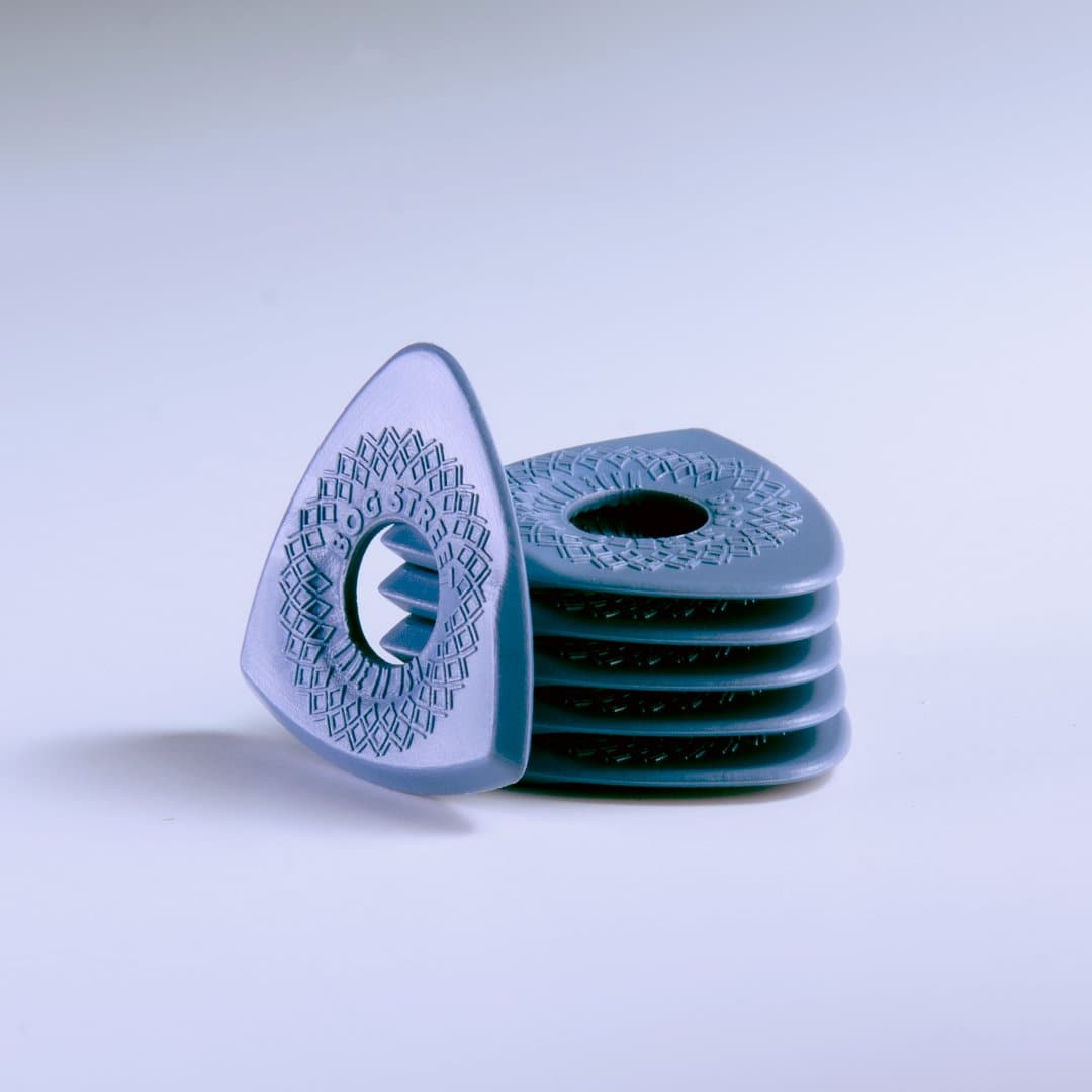 These picks are molded from a high-grade acetal copolymer called Lupital. Lupital is one of the strongest engineering plastics available and is known for its high strength, high impact resistance, and toughness. It creates a warm tone and smooth string release.
