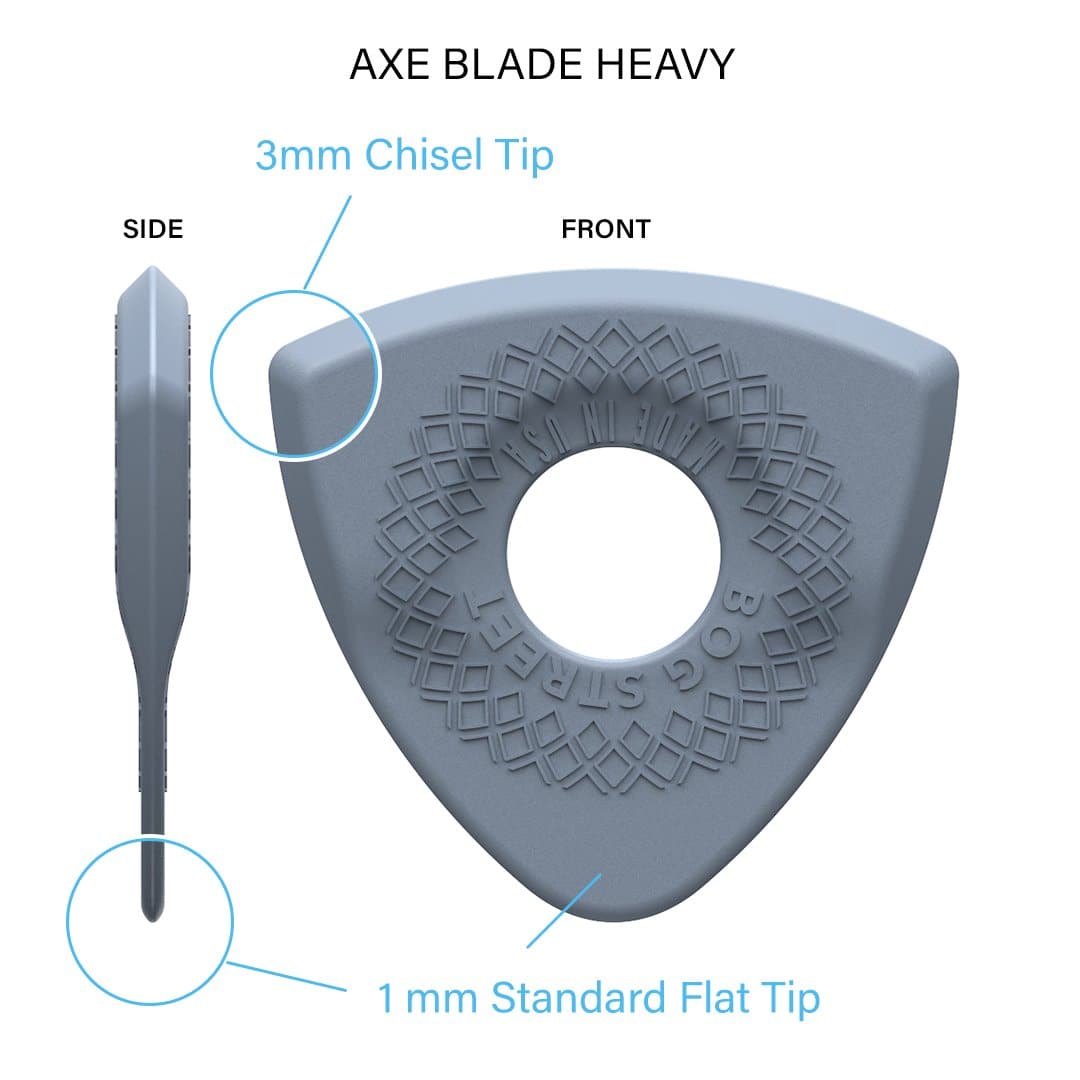 The 3-sided textured Axe Blade Heavy features a 1.0 mm flat tip and two 3.0mm sharp chisel tips. This pick gives players a standard flat pick with low/medium flex, and two heavy-weight sharp bevel tip edges for changing up attack without changing picks.