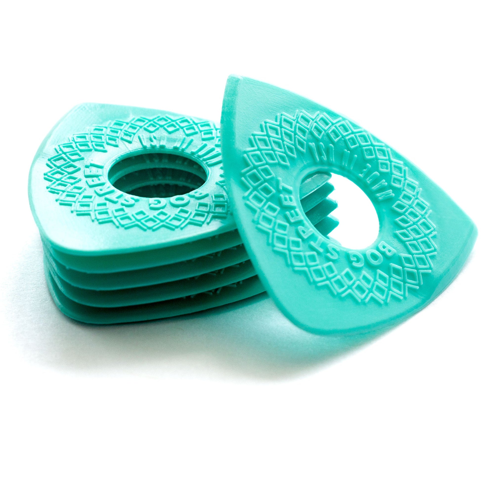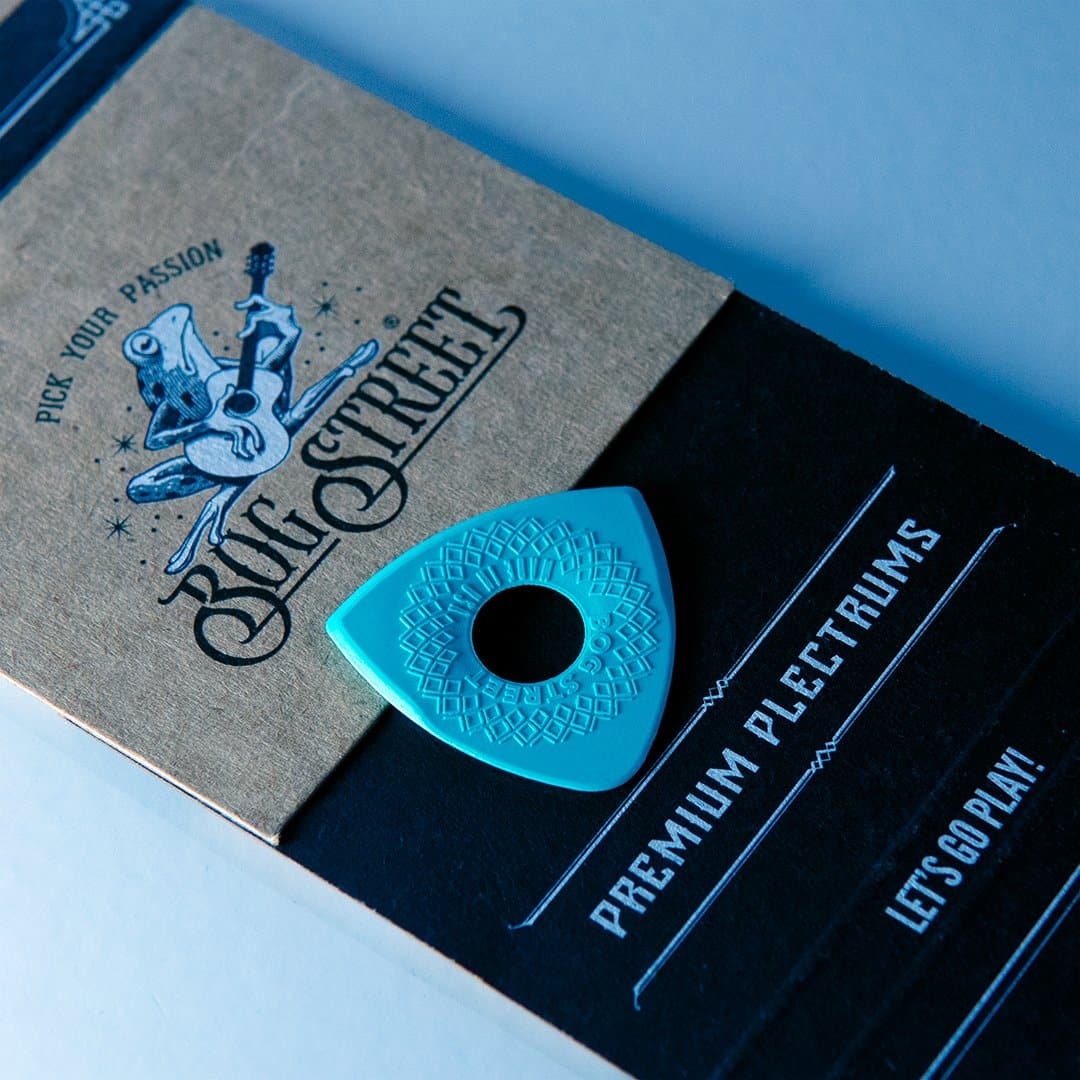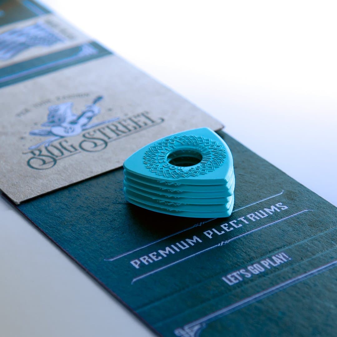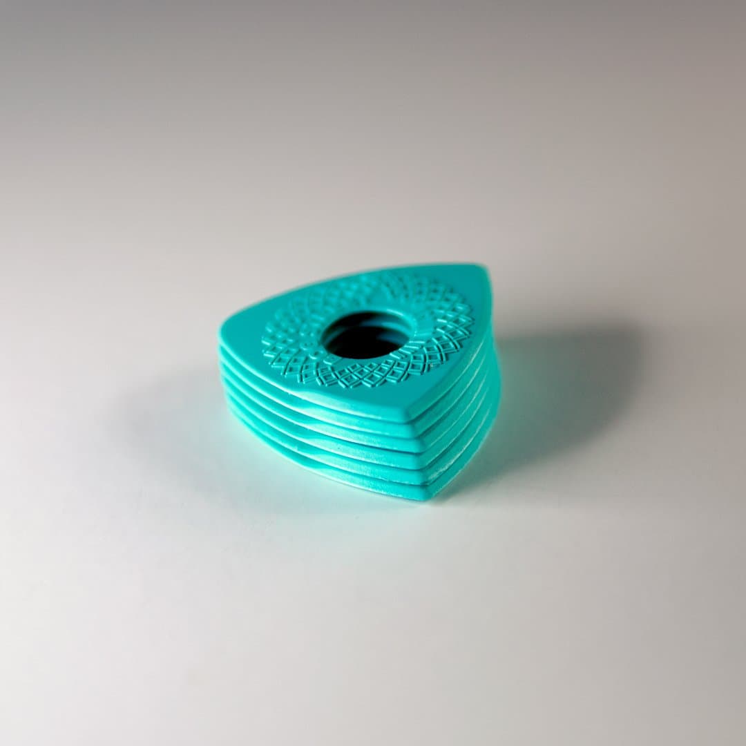 These picks are molded from a high-grade acetal copolymer called Lupital. Lupital is one of the strongest engineering plastics available and is known for its high strength, high impact resistance, and toughness. It creates a warm tone and smooth string release.