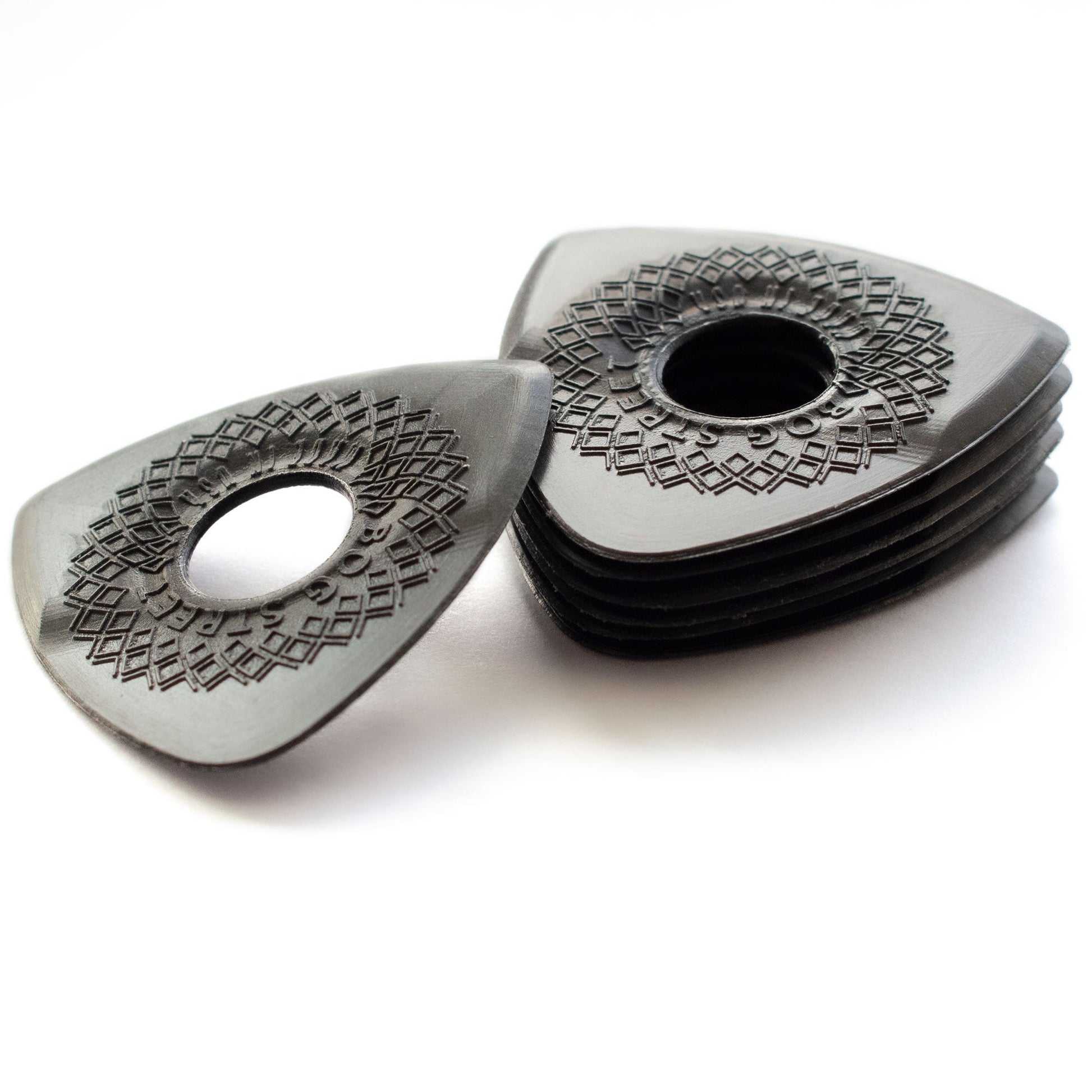These picks are molded from a high-grade acetal copolymer called Lupital. Lupital is one of the strongest engineering plastics available and is known for its high strength, high impact resistance, and toughness. It creates a warm tone and smooth string release.