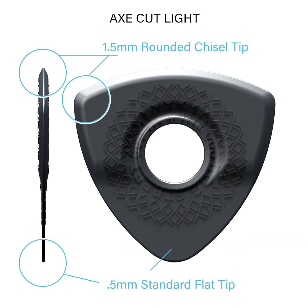 The 3-sided Axe Cut Light features a .5mm flat tip and two 1.5mm rounded chisel tips. This pick gives players a thin standard flat pick with light flex, and two medium-weight sharp bevel tip edges for changing up attack without changing picks.