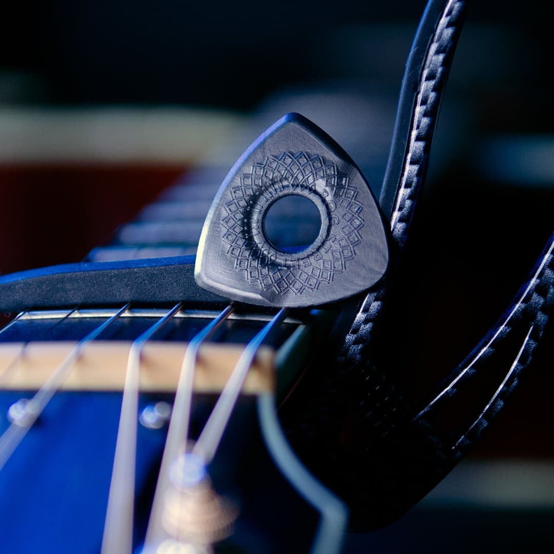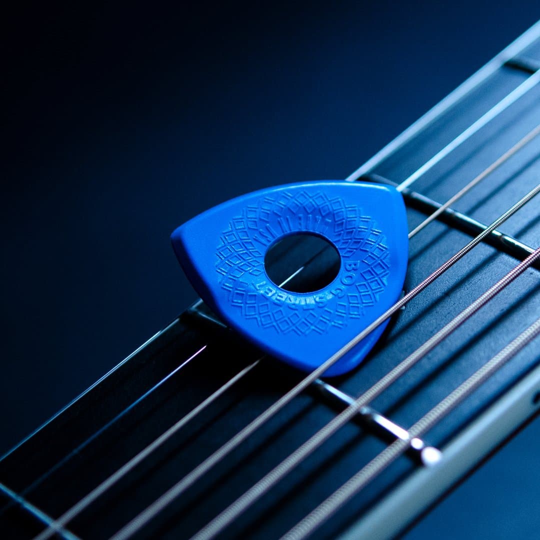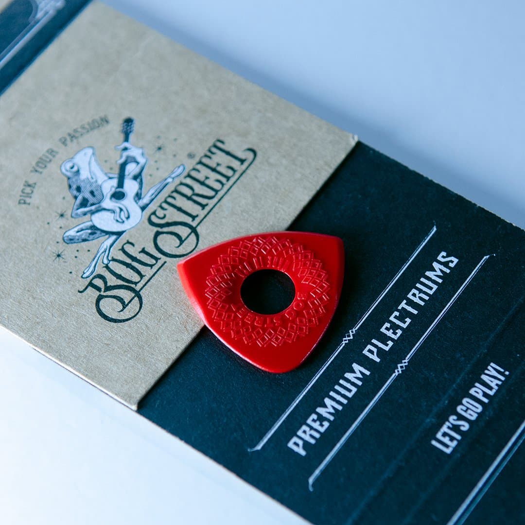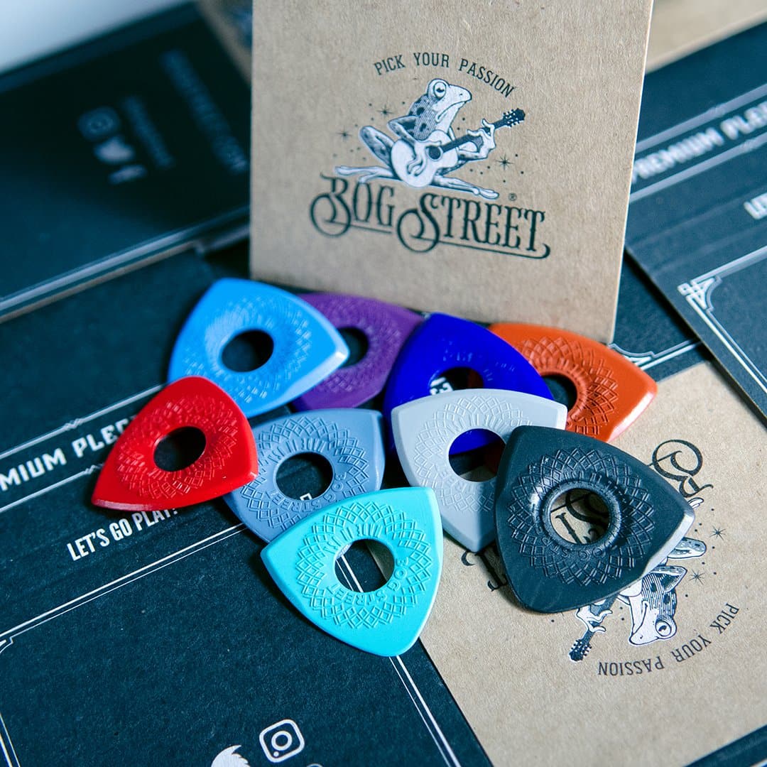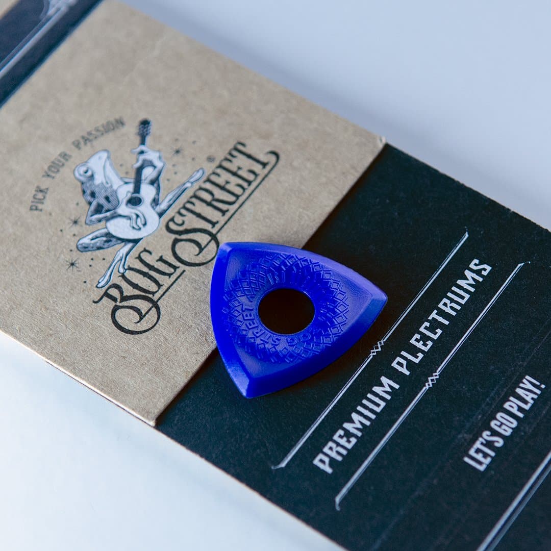 Bog street picks are uniquely manufactured one at a time and laser finished to the highest standards of quality. This process creates a continuous molded edge around all 3-sides of the pick for optimal string release. These picks are molded from a high-grade acetal copolymer called Lupital. Lupital is one of the strongest engineering plastics available and is known for its high strength, high impact resistance, and toughness. It creates a warm tone and smooth string release.