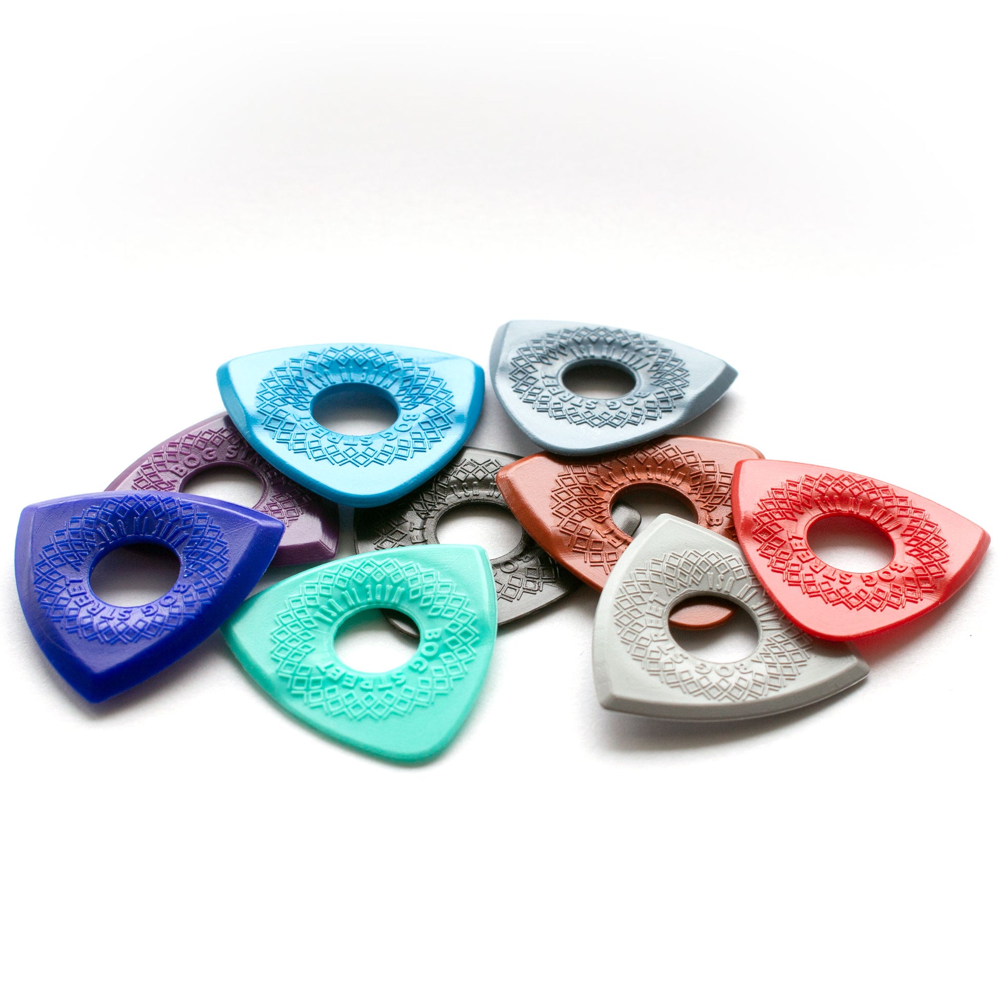The new AXE Series Smooth-Edge picks have been thoughtfully designed and meticulously engineered to maximize comfort and control through our patent-pending ergonomic designs. The new geometric cat's tongue grip pattern provides a unique feel and added security to prevent unwanted pick rotation and slippage. The curved form is designed for optimal comfort and center hole allows contact between the players index finger and thumb for improved feel and control.