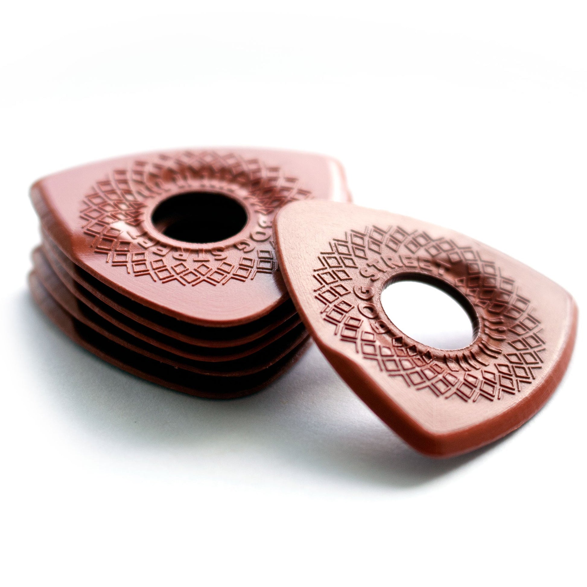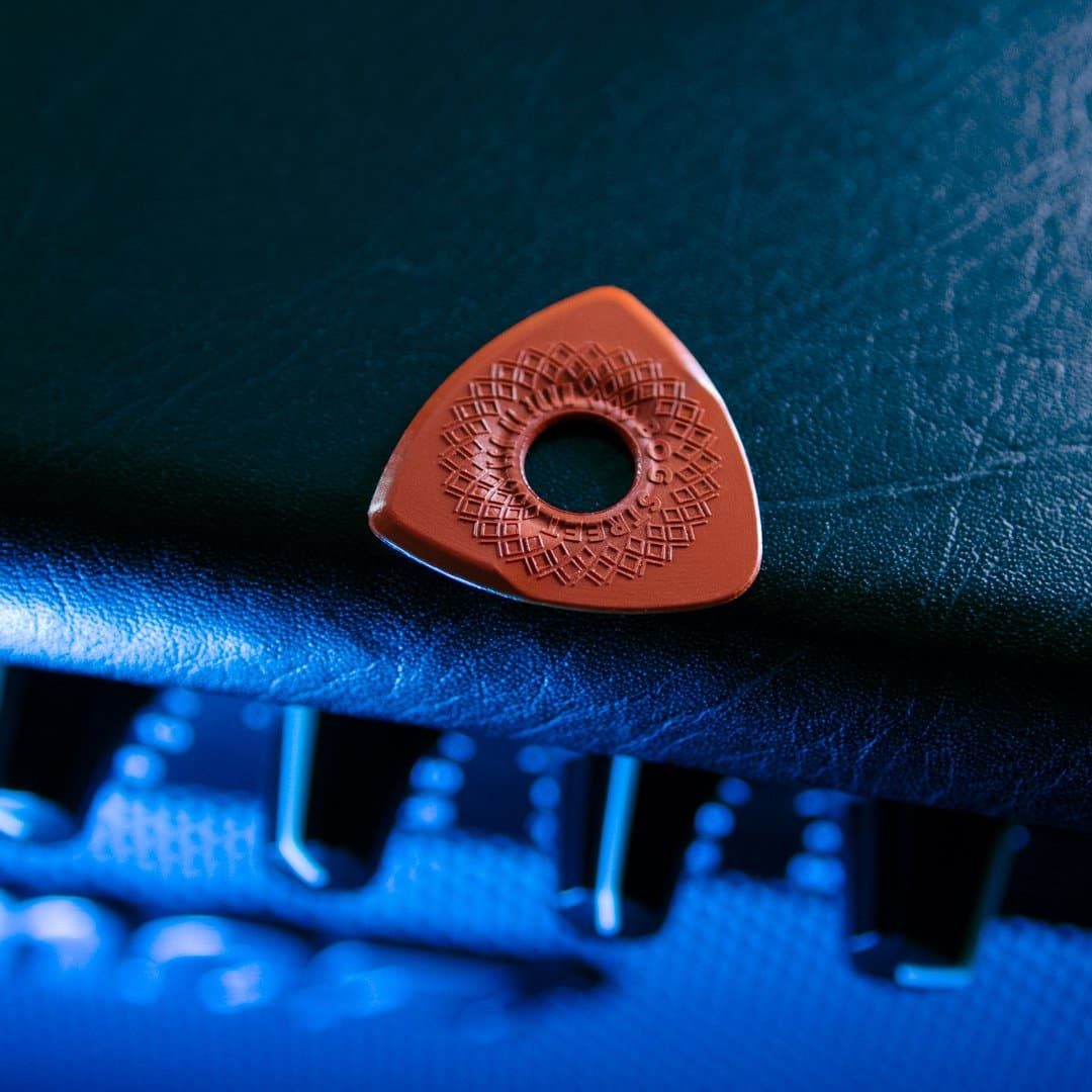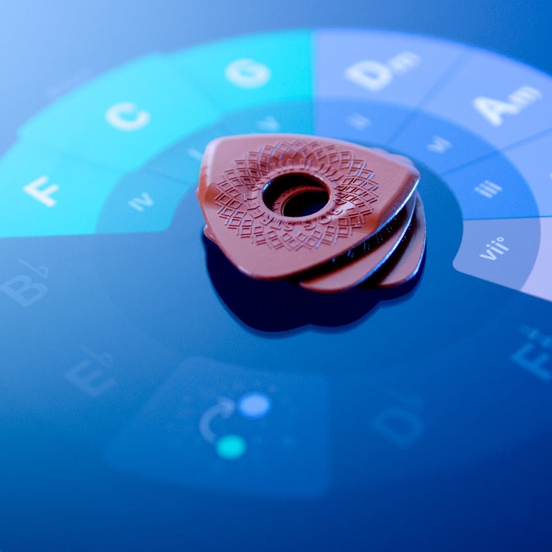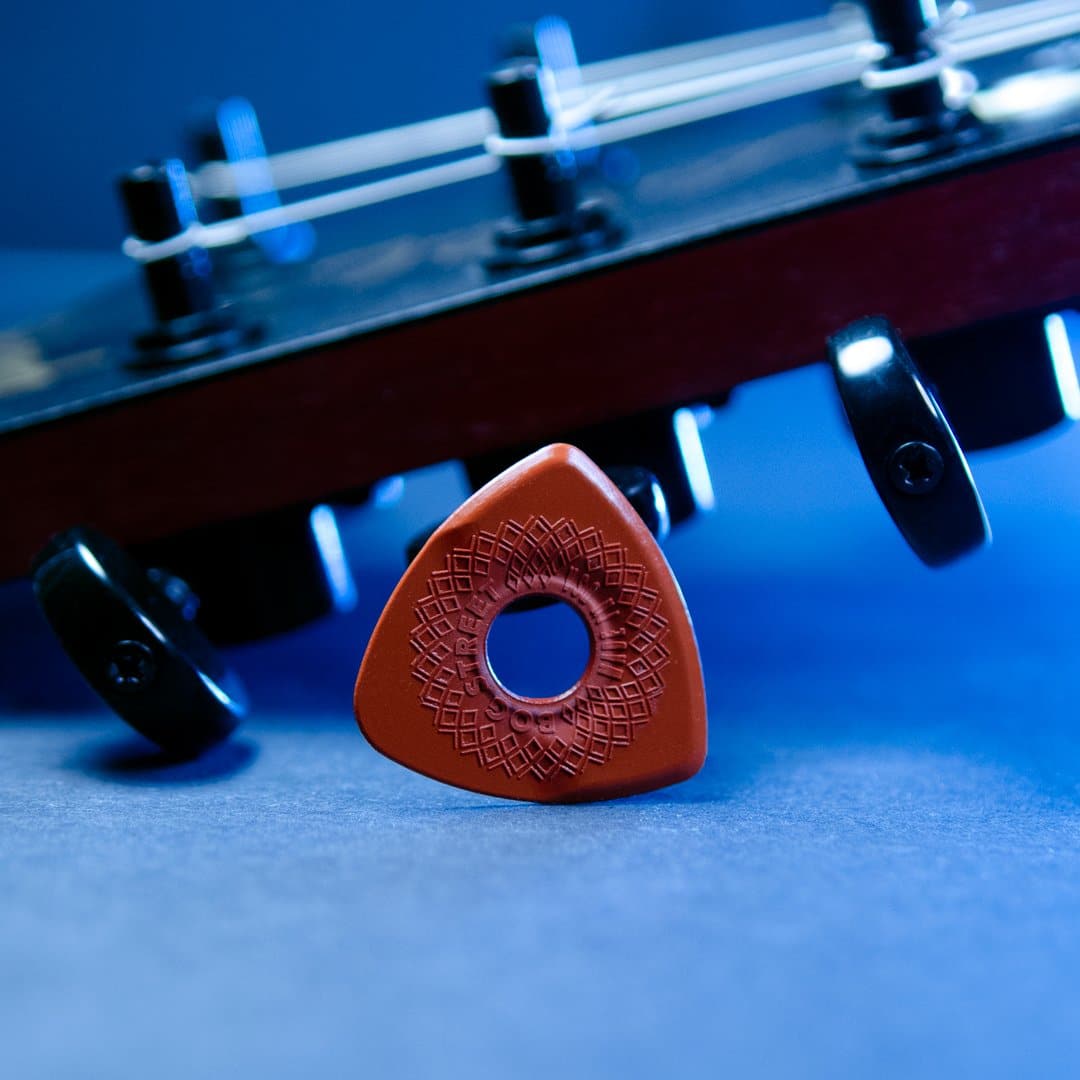 These picks are molded from a high-grade acetal copolymer called Lupital. Lupital is one of the strongest engineering plastics available and is known for its high strength, high impact resistance, and toughness. It creates a warm tone and smooth string release.