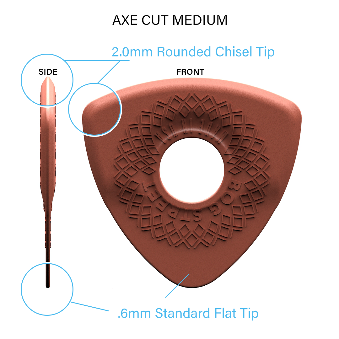 The 3-sided Axe Cut Medium features a .6mm flat tip and two 2.0mm rounded chisel tips. This pick gives players a thin standard flat pick with light flex, and two medium-weight sharp bevel tip edges for changing up attack without changing picks.