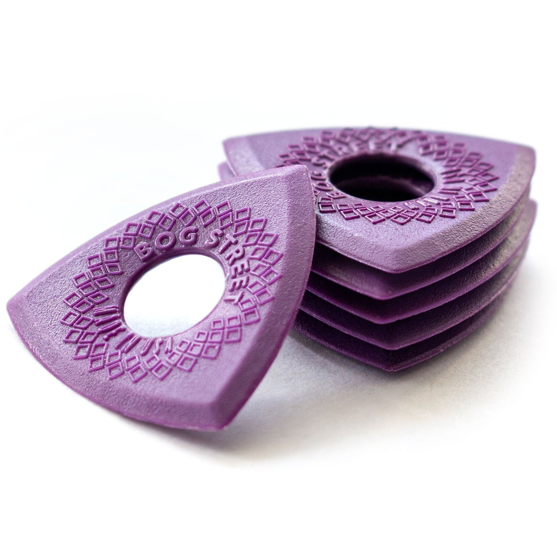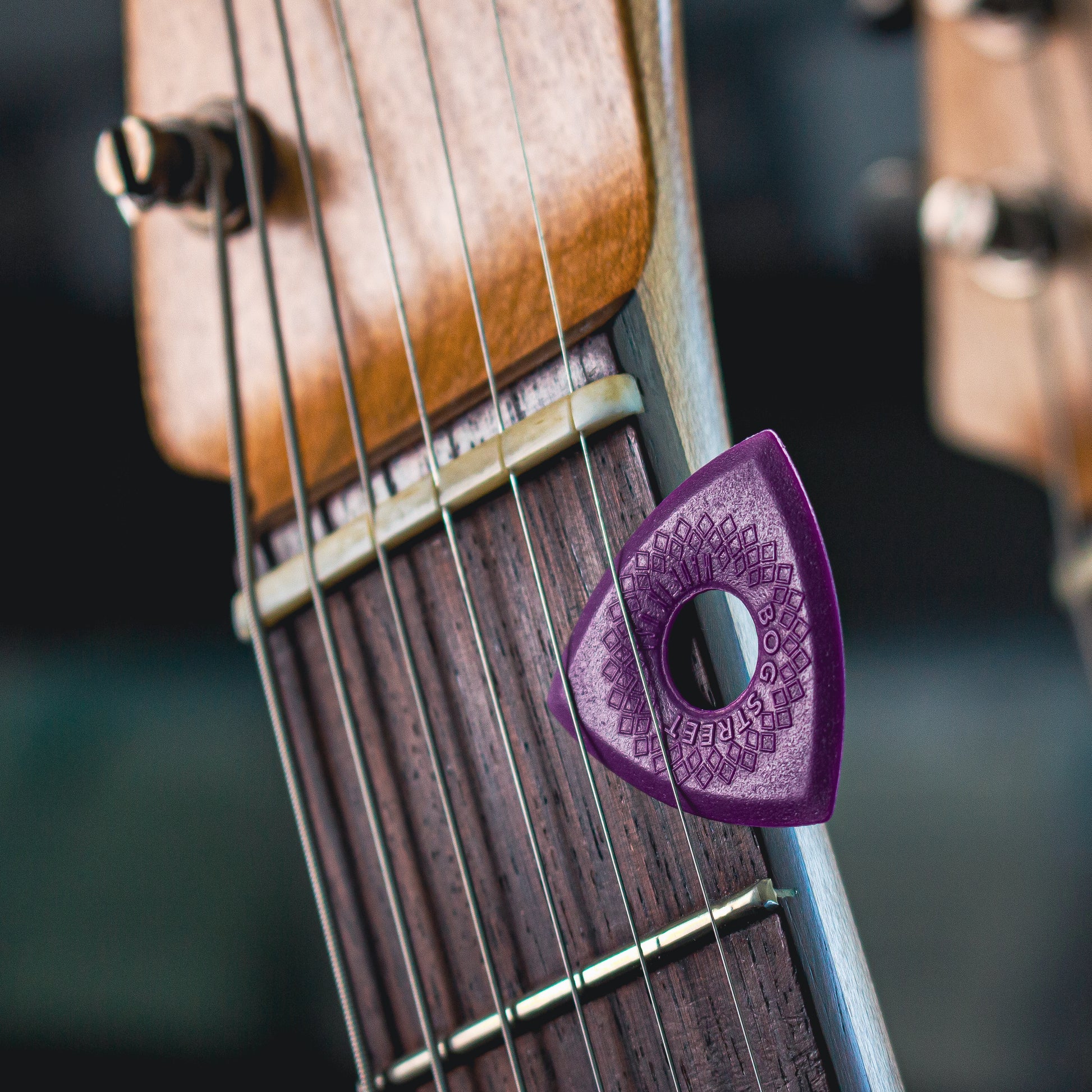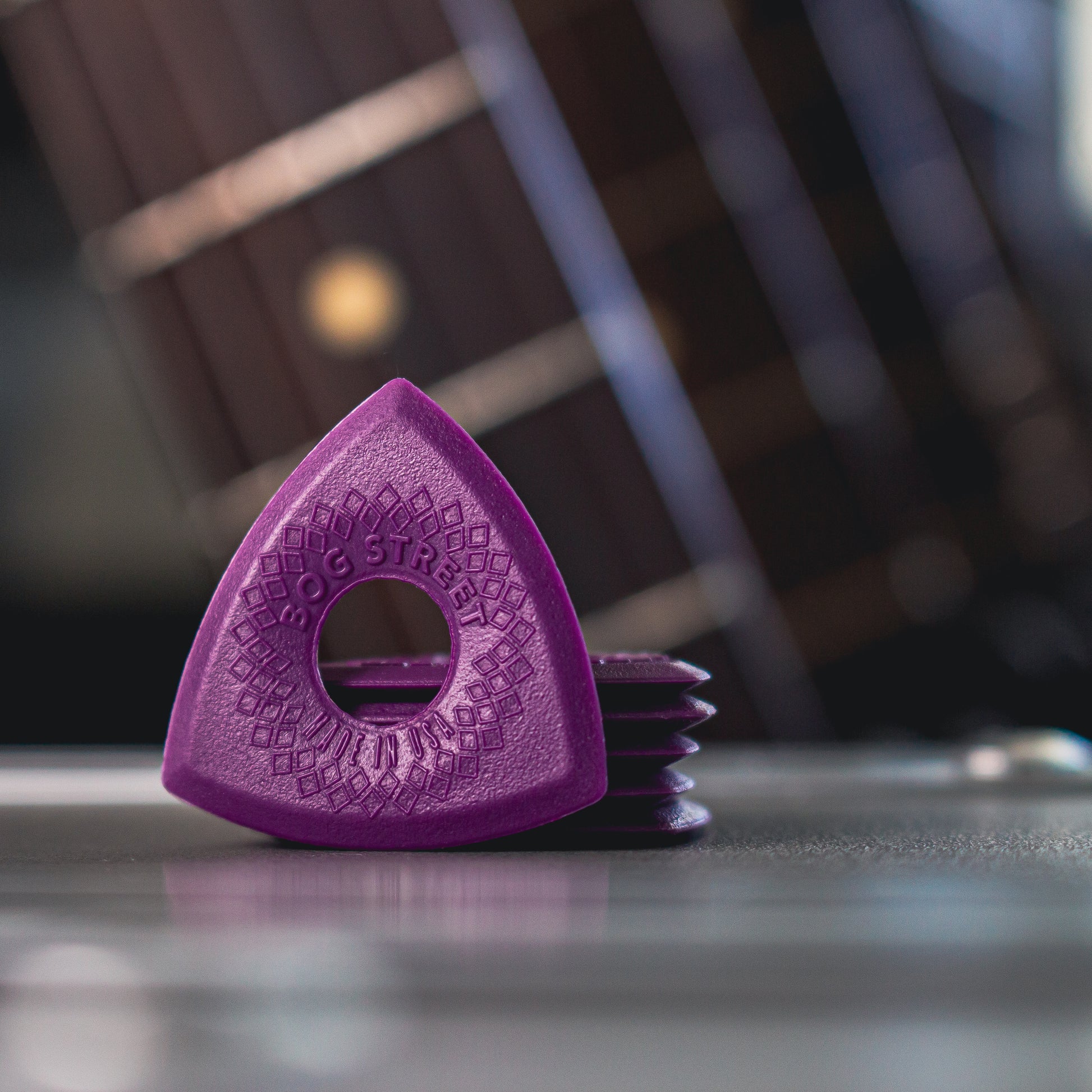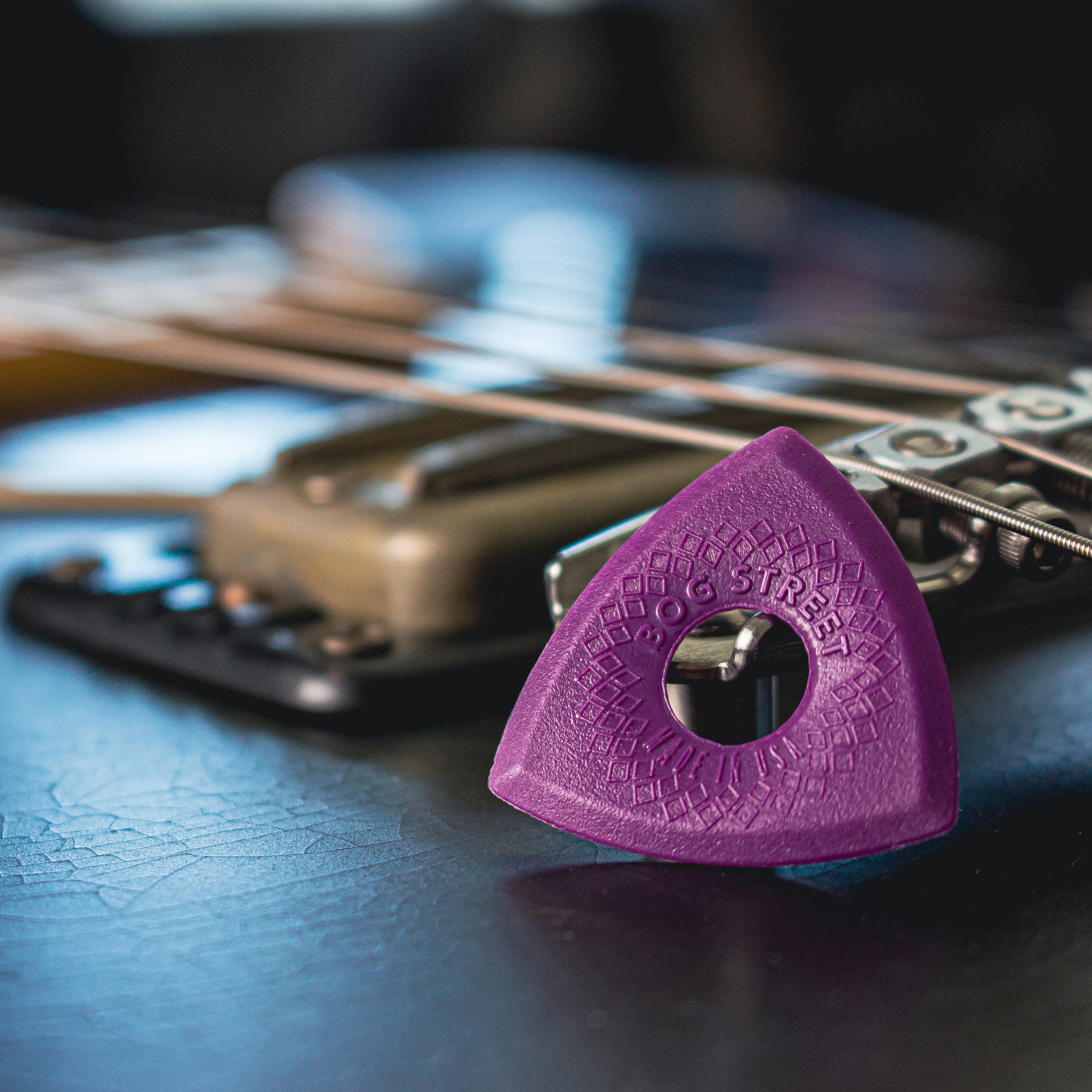 These picks are molded from a high-grade acetal copolymer called Lupital. Lupital is one of the strongest engineering plastics available and is known for its high strength, high impact resistance, and toughness. It creates a warm tone and smooth string release.