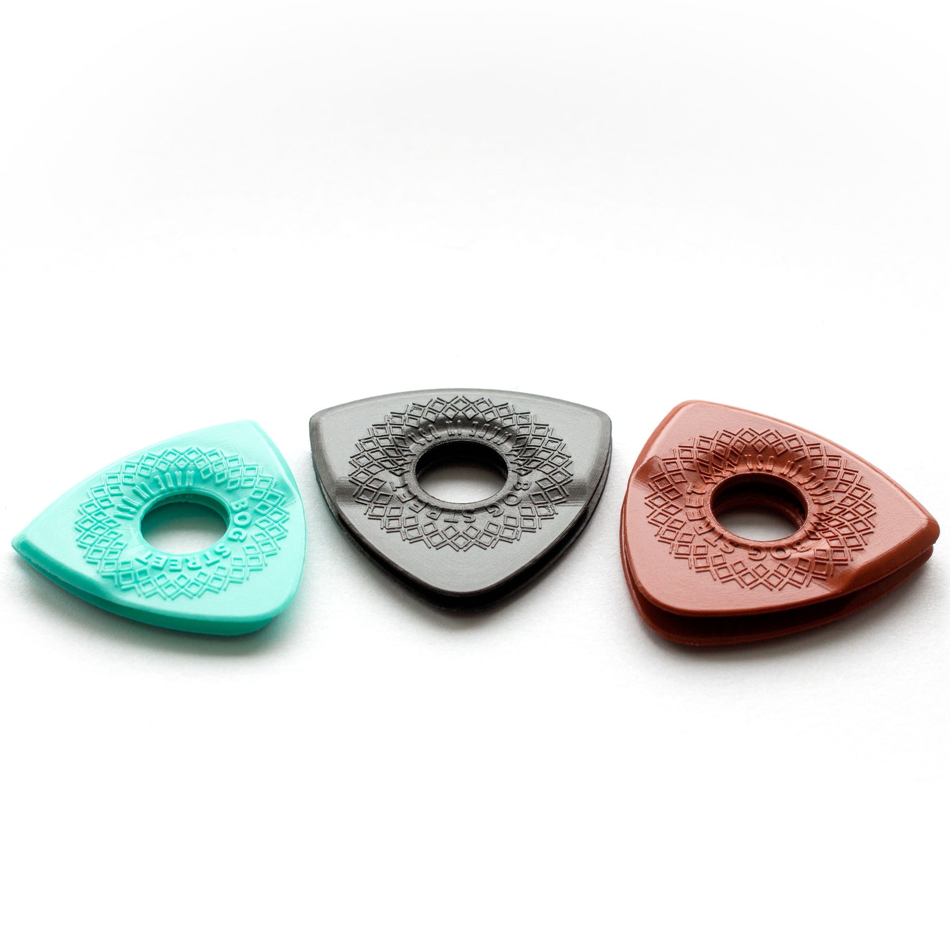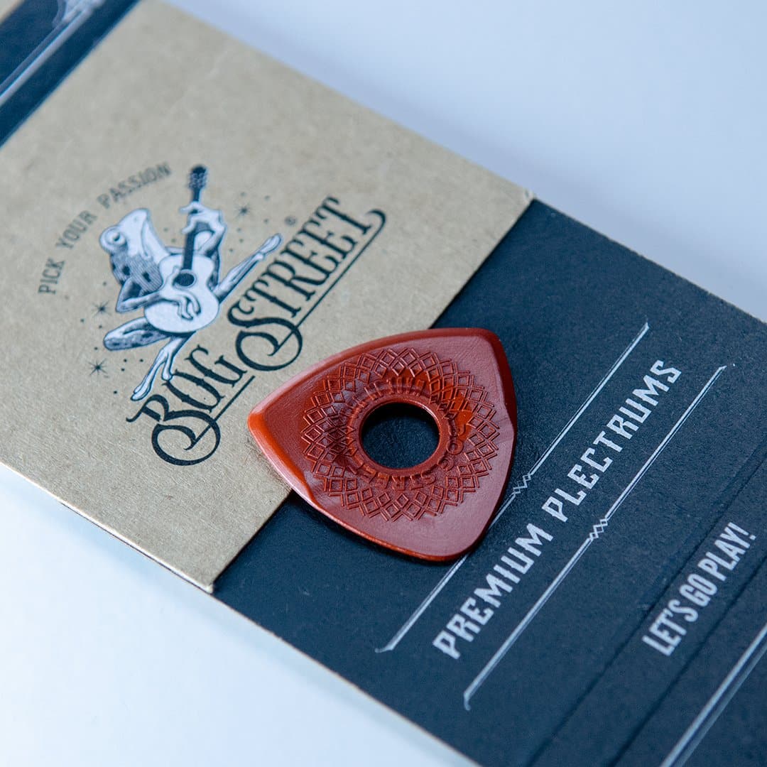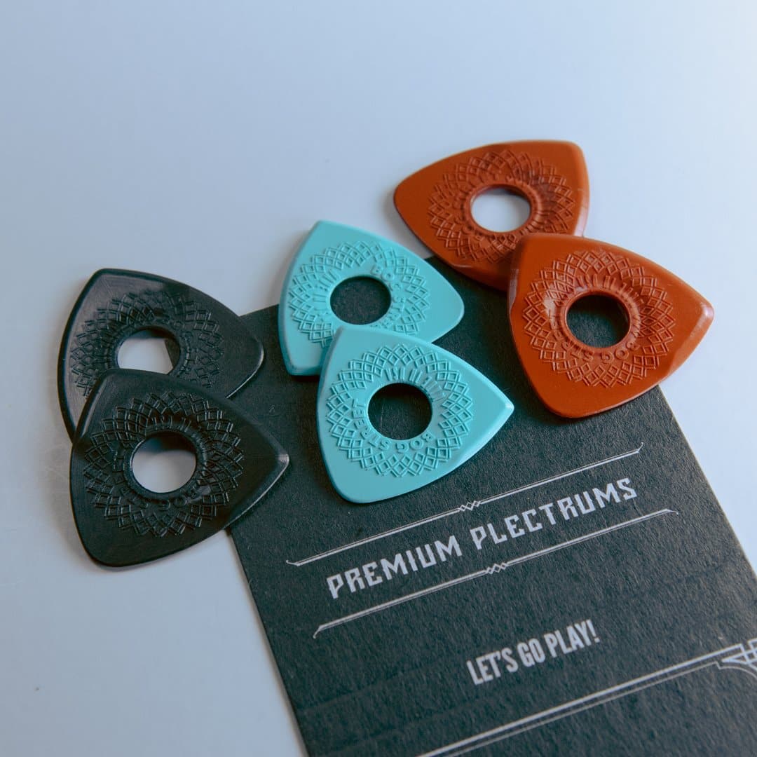 Bog street picks are uniquely manufactured one at a time and laser finished to the highest standards of quality. This process creates a continuous molded edge around all 3-sides of the pick for optimal string release. These picks are molded from a high-grade acetal copolymer called Lupital. Lupital is one of the strongest engineering plastics available and is known for its high strength, high impact resistance, and toughness. It creates a warm tone and smooth string release.