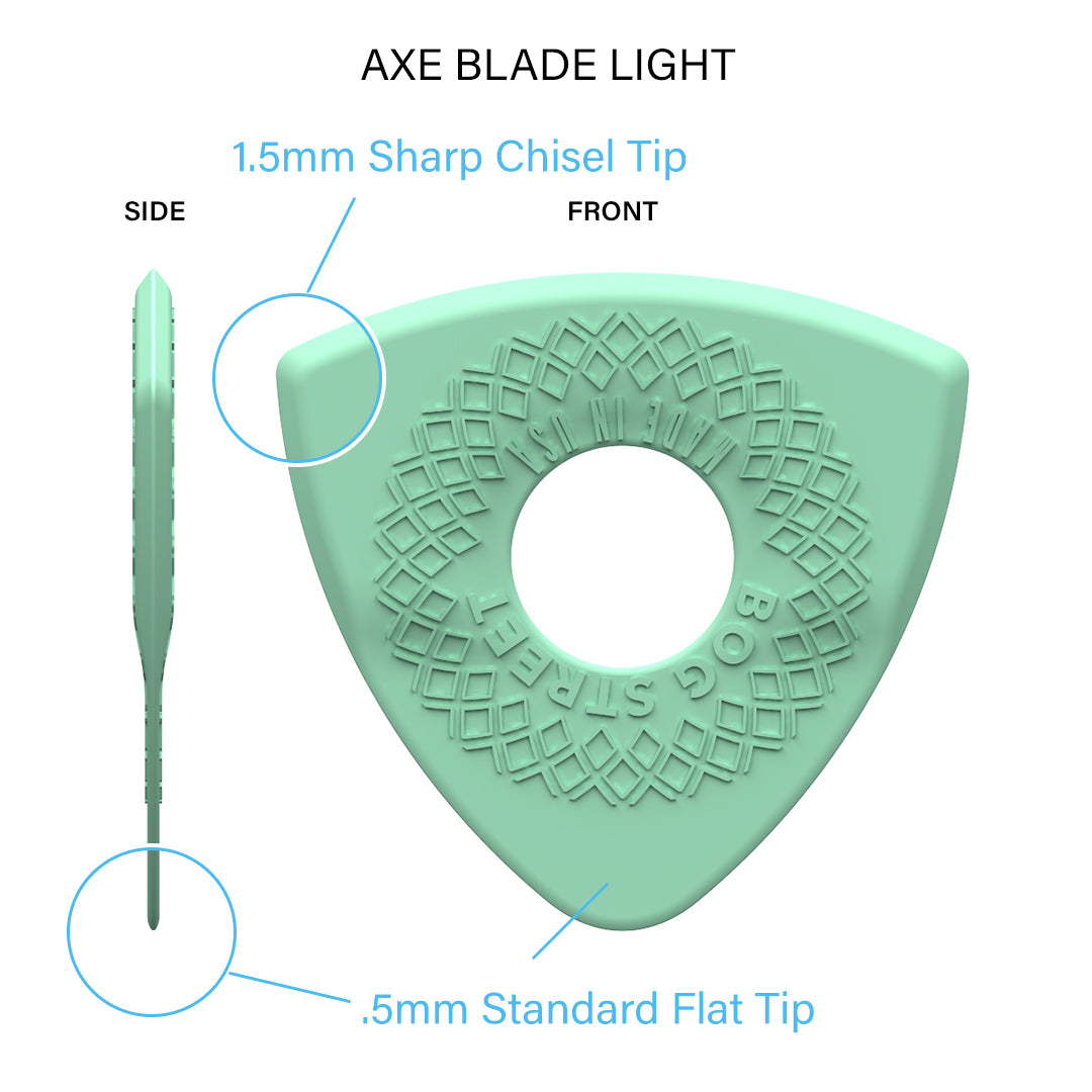 This mix pack contains TWO of each of the Medium/Light NEW Axe Series smooth-edge picks. See sizing chart for overall pick dimensions. Thickness listed below.
