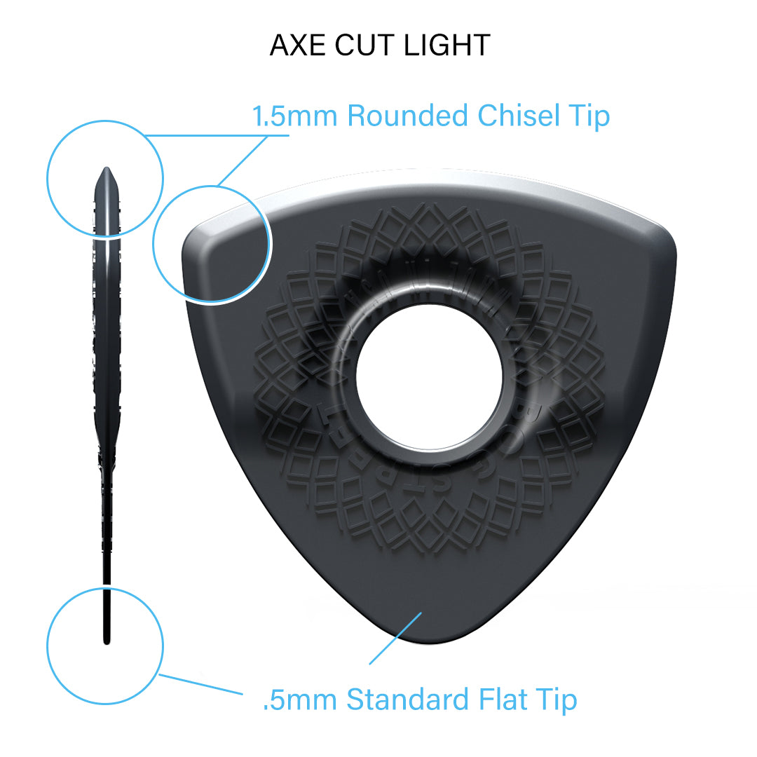 The new AXE Series Smooth-Edge picks have been thoughtfully designed and meticulously engineered to maximize comfort and control through our patent-pending ergonomic designs. The new geometric cat's tongue grip pattern provides a unique feel and added security to prevent unwanted pick rotation and slippage. The curved form is designed for optimal comfort and center hole allows contact between the players index finger and thumb for improved feel and control.